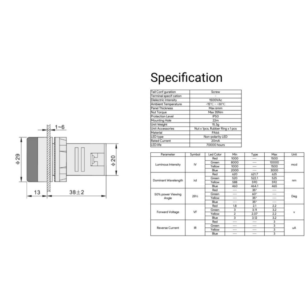 Indicador/avisador redondo de painel, LED industrial de 22 mm, 12 V, verde