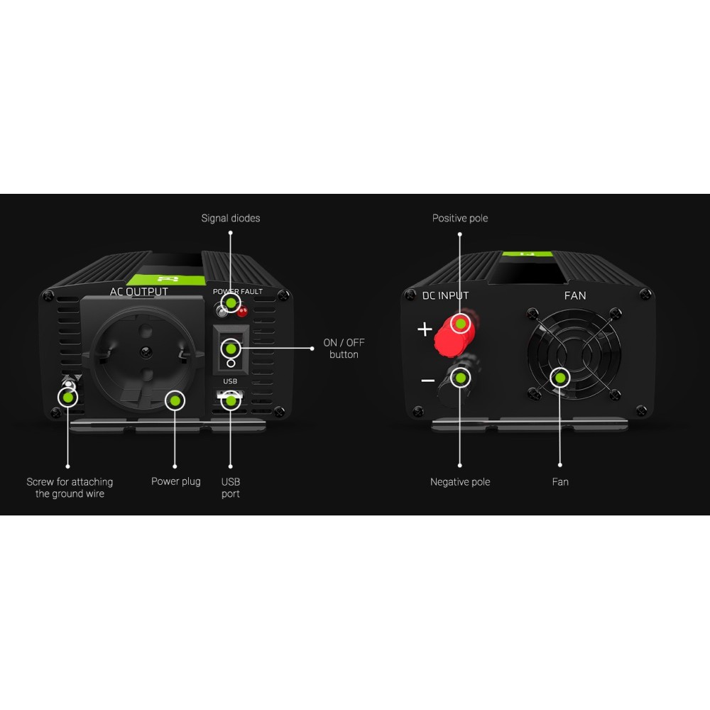 O inversor Green Cell converte a tensão DC de 12 V proveniente de baterias ou isqueiros de veículos em corrente AC de 230 V a mesma fornecida pela rede elétrica doméstica. Permite alimentar equipamentos eletrónicos em carros, autocaravanas, camiões e embarcações, sendo ideal para utilização em locais sem acesso à rede pública.