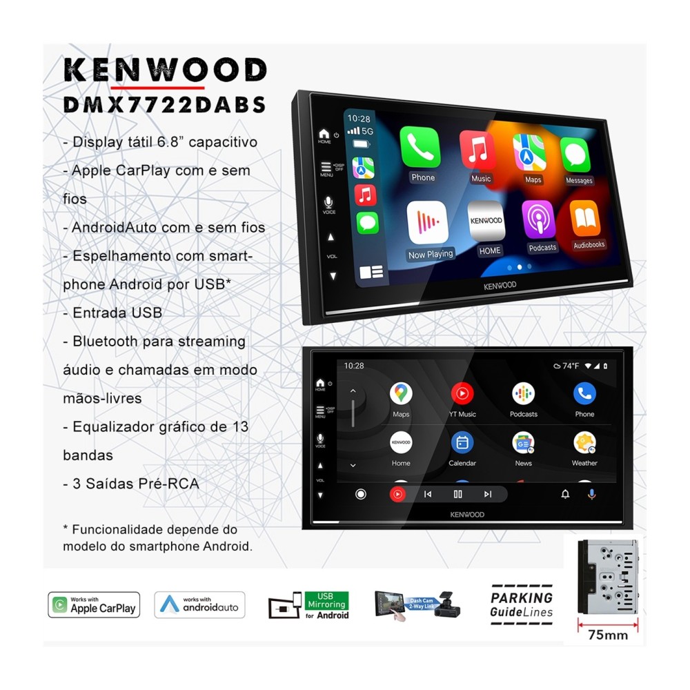 - O Kenwood DMX7722DABS é um avançado centro multimédia 2din com um display tátil capacitivo de 6.8", compatível com o teu smartphone para utilizares de forma segura e intuitiva aplicações como Carplay e Android Auto (por usb ou por wifi sem fios).