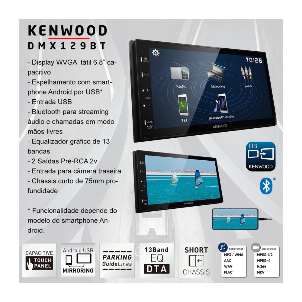 O Kenwood DMX129BT é um avançado centro multimédia 2din com um display tátil capacitivo de 6.8" WVGA, compatível com o teu smartphone para utilizares "Android USB Mirroring"* (espelhamento do smartphone androidpor cabo usb). Além da conectividade com o teu smartphone Android, a entrada usb traseira permite a reprodução de ficheiros áudio e vídeo e o módulo bluetooth permite realizar chamadas em modo mãos-livres e streaming áudio. O chassis curto com apenas 75mm de profundidade torna compatível a instalação com grande parte dos modelos automóveis.