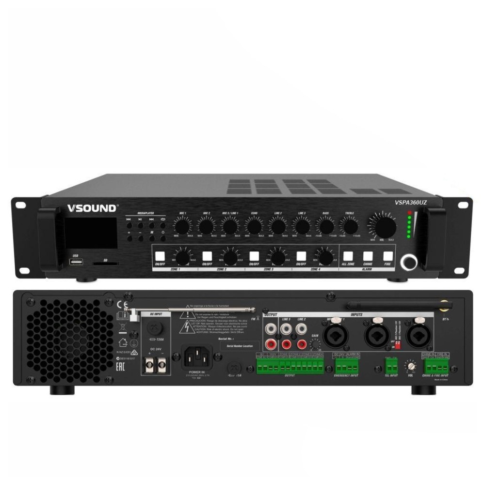 Amplificador PA 24/230V, 4 Zonas, 360W, 100V, Mp3/USB/SD/BT, da marca VSOUND