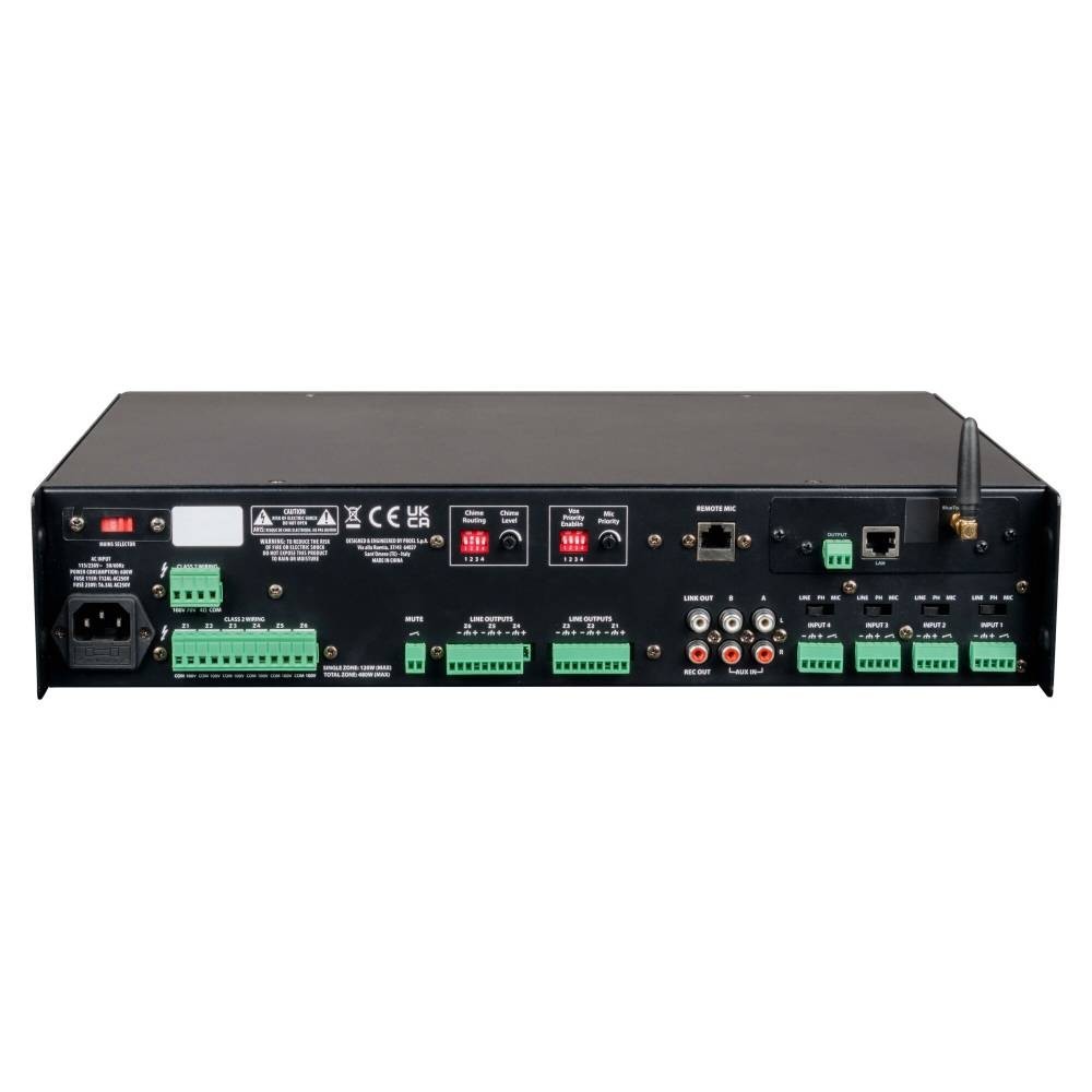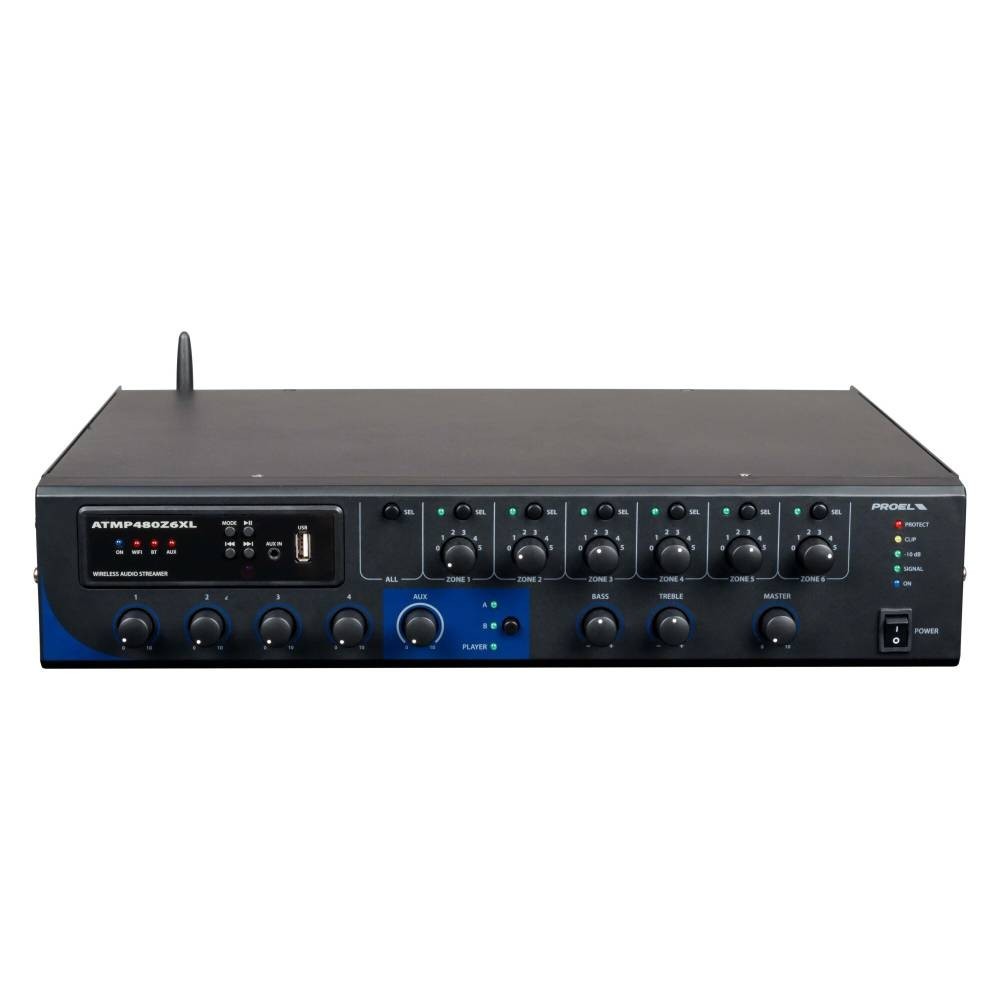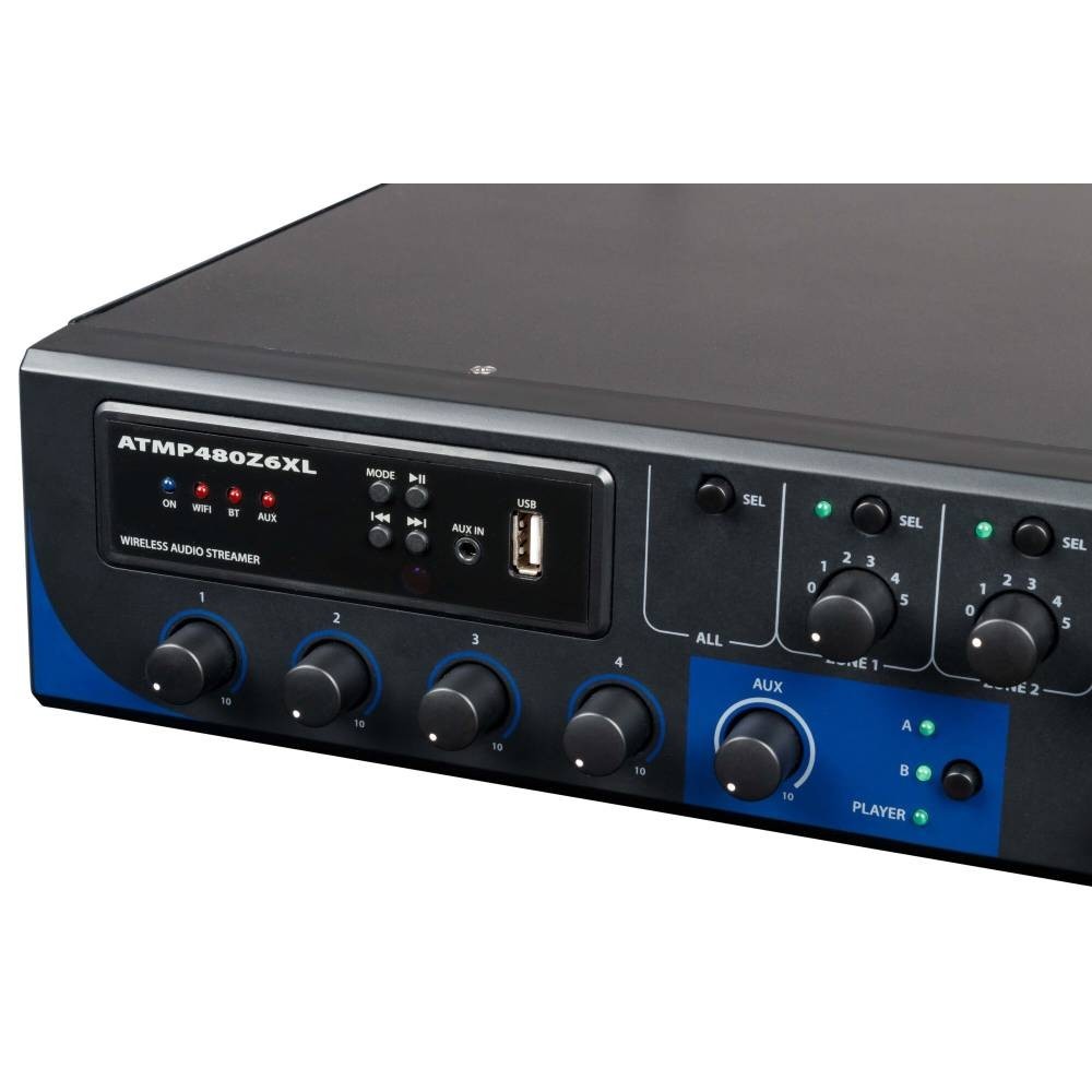 Amplificador misturador profissional capaz de fornecer até 480W em 6 zonas, completo com Media Player equipado com leitor USB/MP3, conexão Bluetooth e interface WiFi