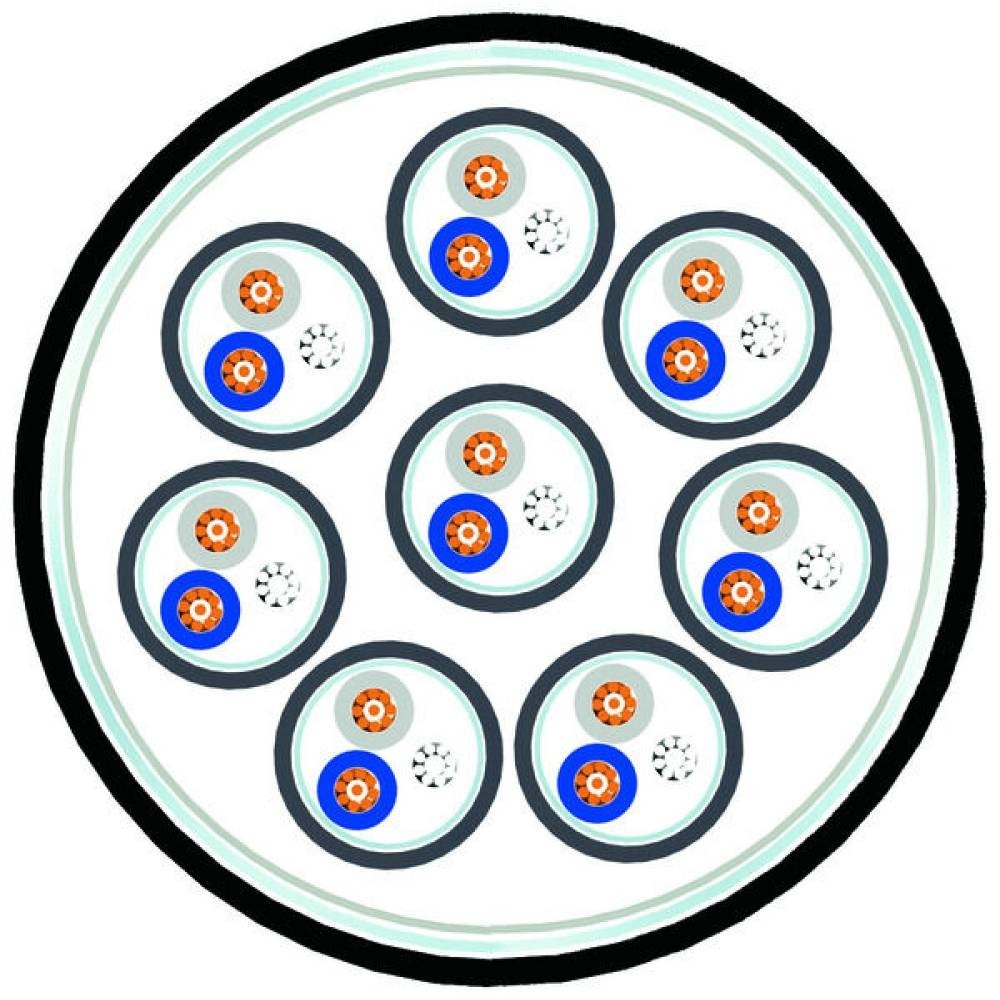 - Cada par é isolado individualmente com folha de alumínio e camisa de PVC, e com números impressos de ambos os lados. O isolamento do condutor é de XLPE branco/azul.