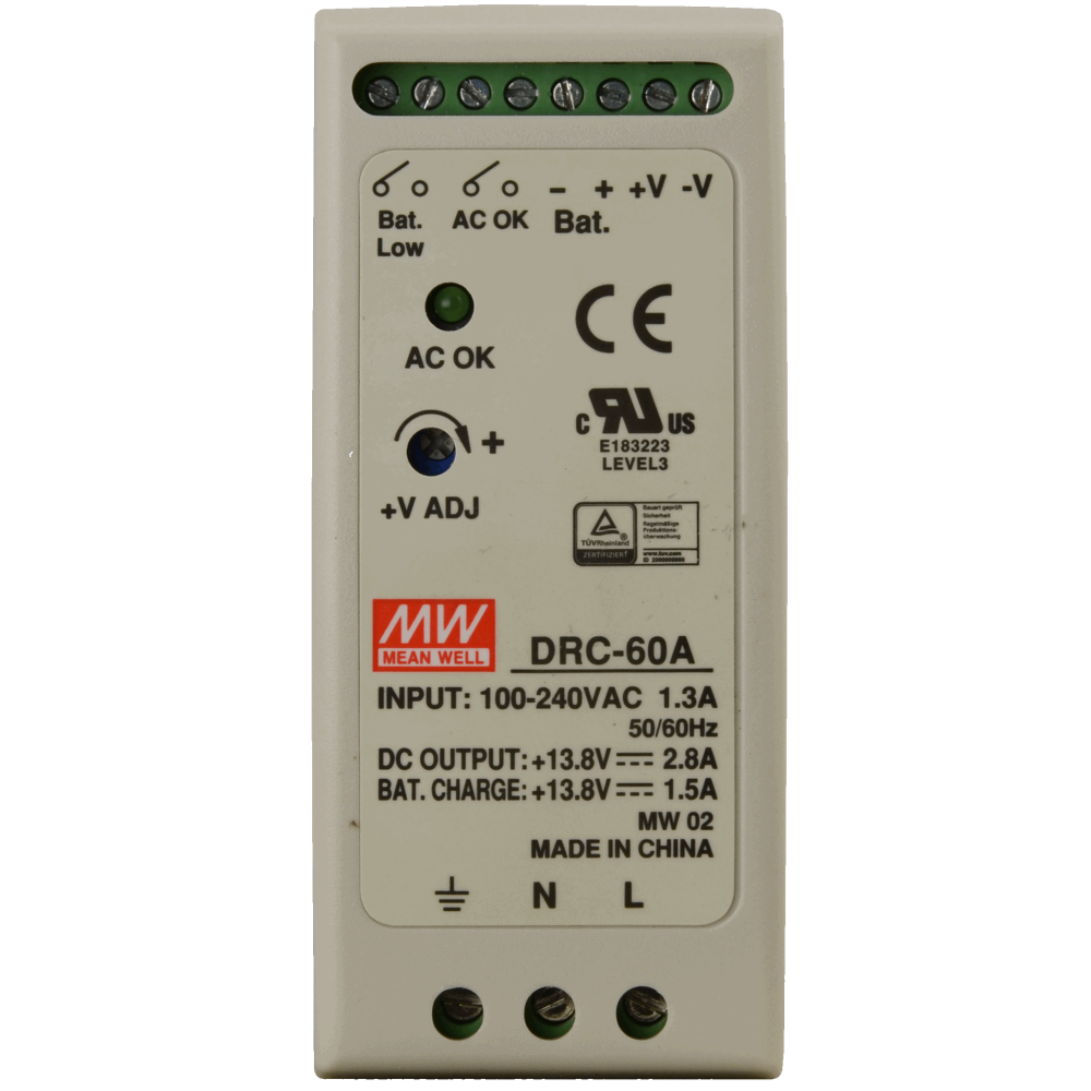 Fonte de alimentação para instalação em calha DIN de 12V, 5A, 60W, da marca MEAN WELL, modelo DRC-60A