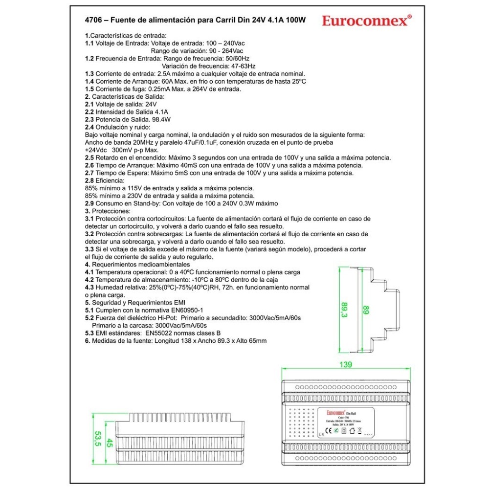 - 1,5 Corrente de fuga: 0,25mA máx. na entrada 264V.