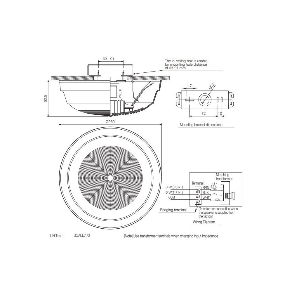 O altifalante PC-2668 pode ser montado (instalação exposta) no teto onde a montagem embutida é impossível.