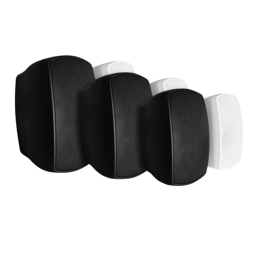 A caixa de plástico à prova de intempéries é equipada com uma grade de metal e tampas sobre as conexões. Além disso, os alto-falantes de parede têm um suporte de montagem giratório e inclinado, que permite a instalação em qualquer ângulo para montagem na parede e no teto.