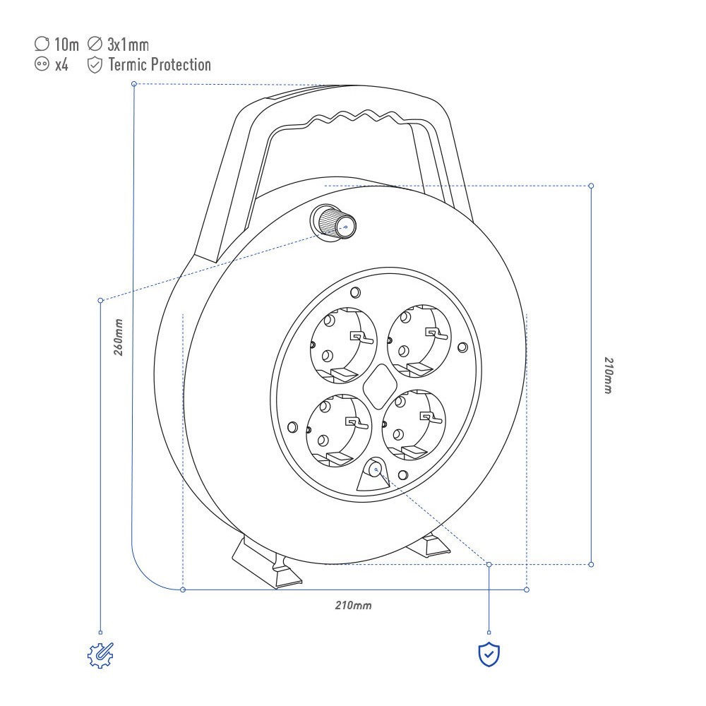 Extensão de Corrente SCHUKO de 4 Vias/tomadas T/TL com Protetor Térmico e Enrolador, 10 metros 3x1mm