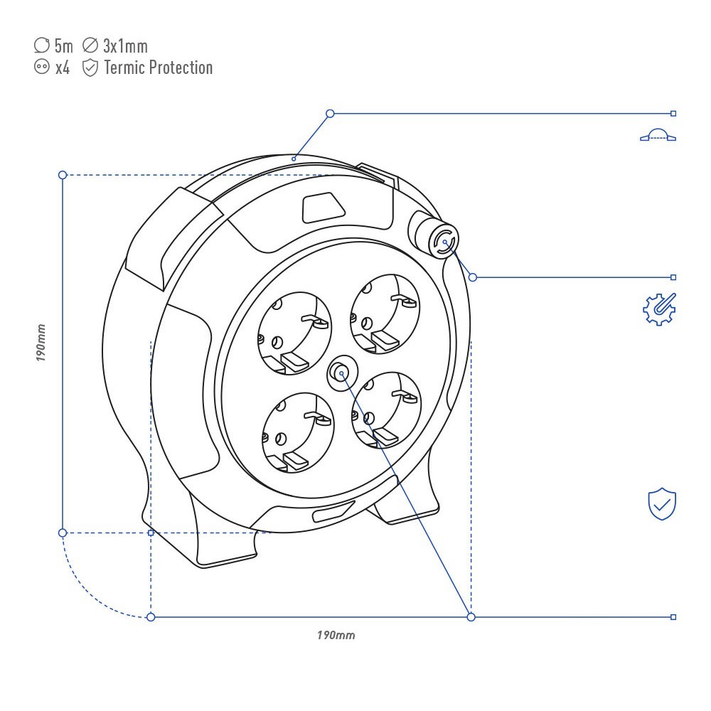 Extensão de Corrente SCHUKO de 4 Vias/tomadas T/TL com Protetor Térmico e Enrolador, 5 metros 3x1mm