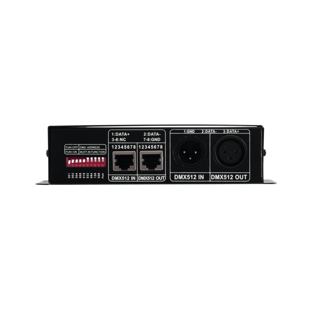 - Controlador de LED compacto de 3 canais para controlar LEDs RGB (12-24 V) via DMX;
