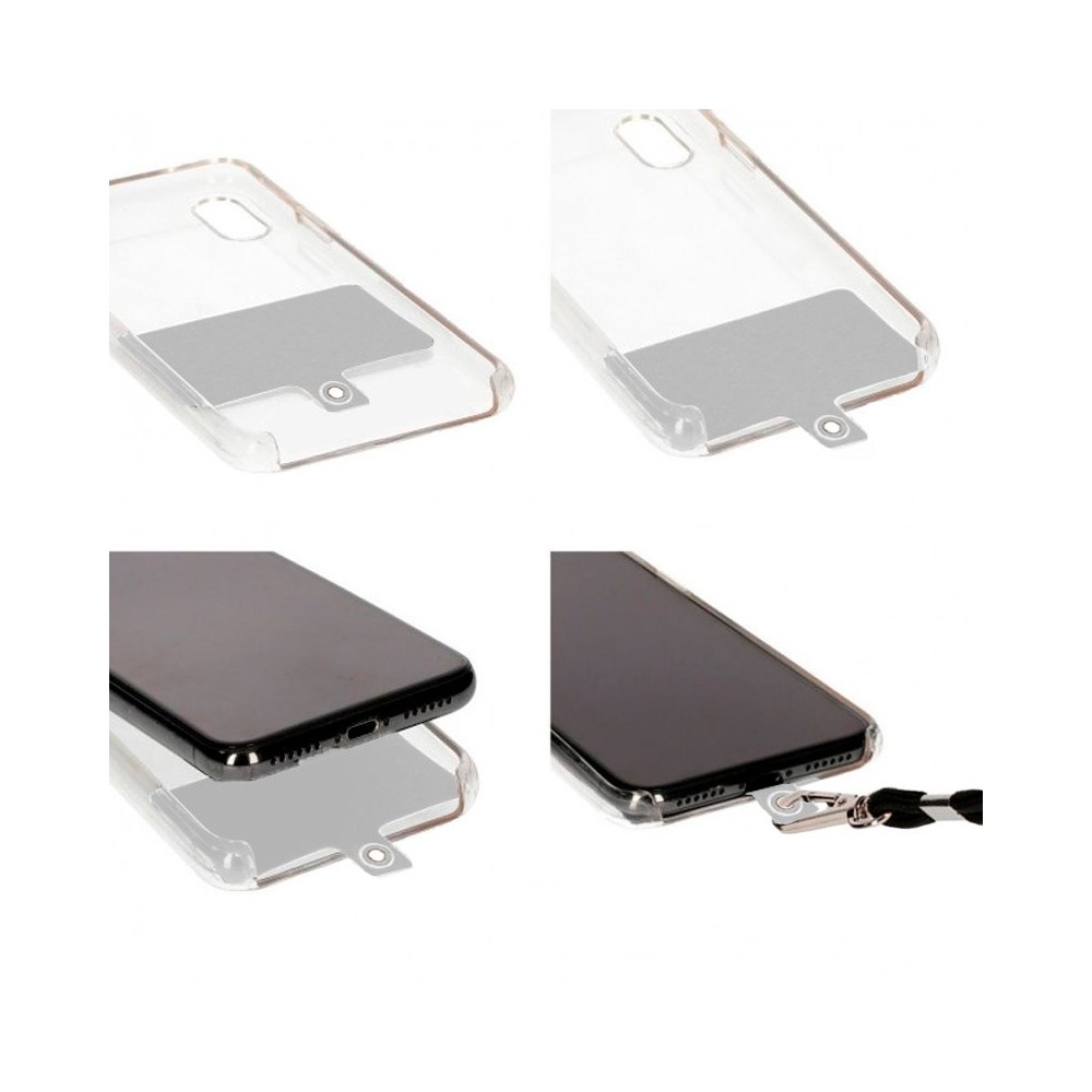 - Com um sistema de fixação por meio de um cartão de plástico (incluído) que é inserido na caixa ou estojo do smartphone, de onde sai uma peça de plástico onde é preso o cabo.
