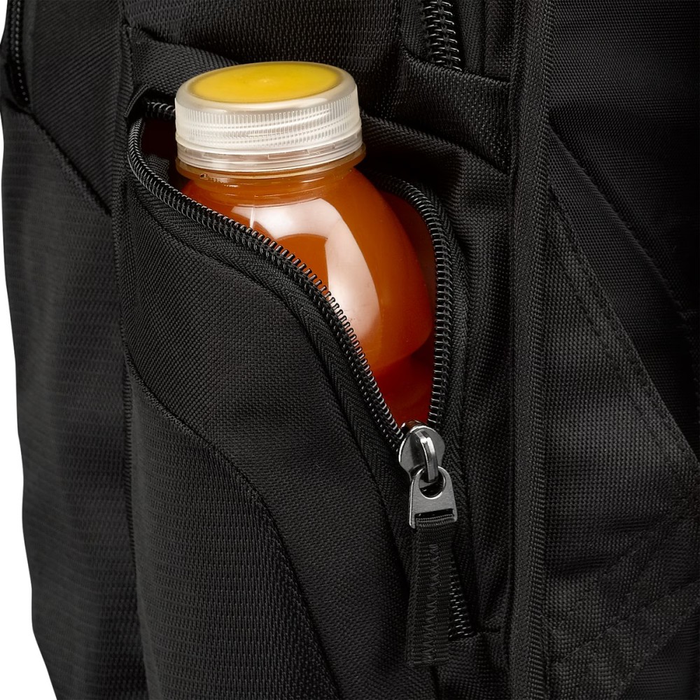 - Bolsos laterais com zíper oferecem acesso rápido a cabos menores, um lanche ou uma garrafa de água