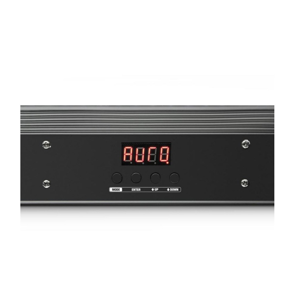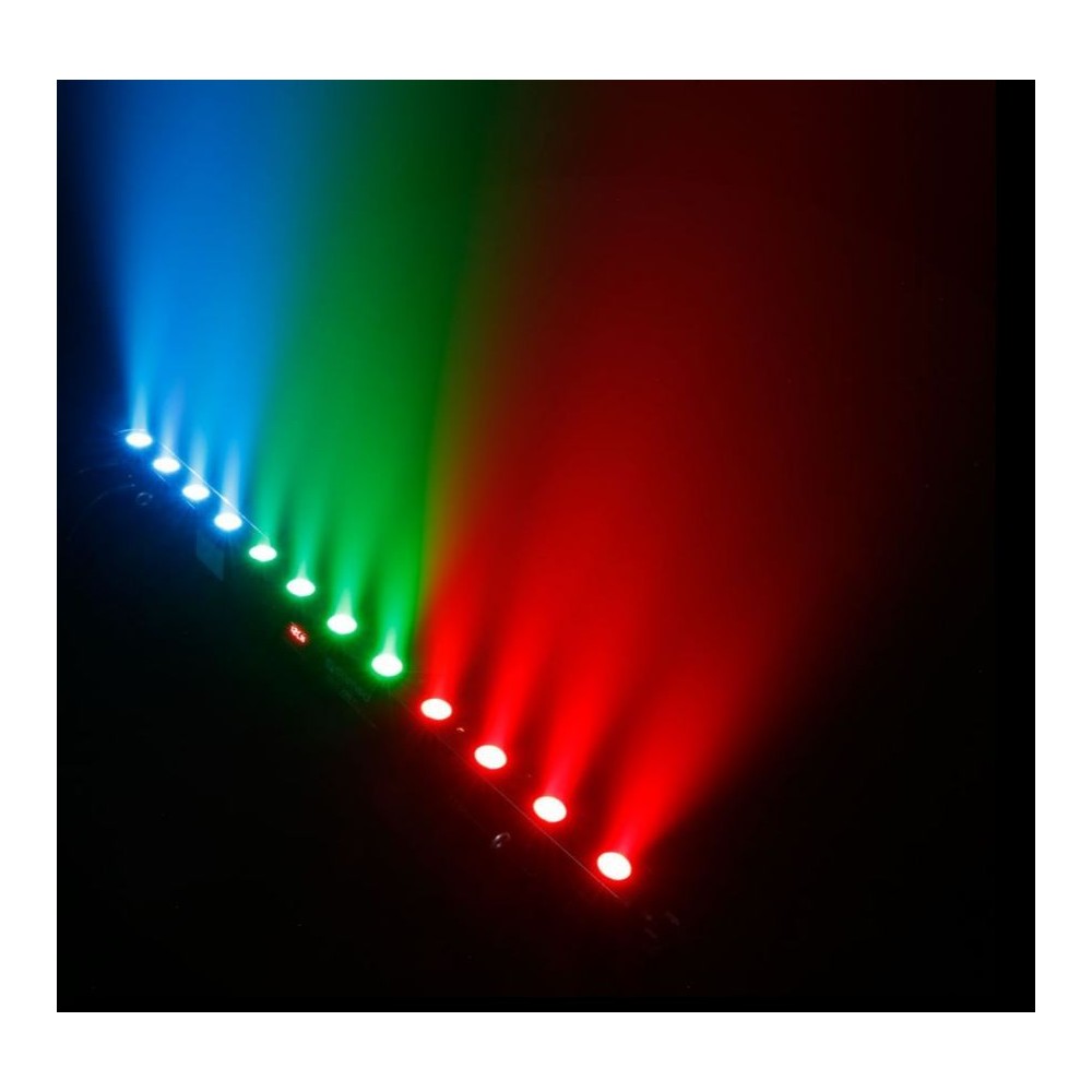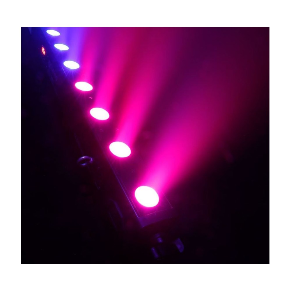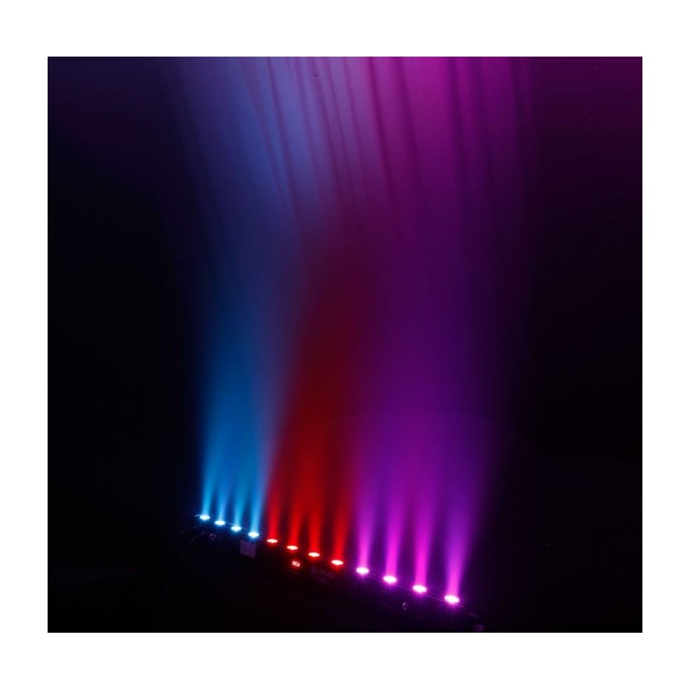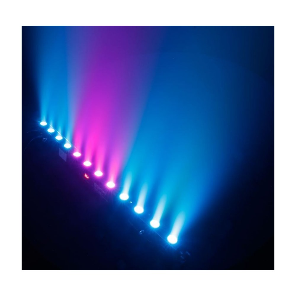 A barra RGB com ângulo de feixe de 20° também pode ser usada como standalone, master ou slave e está equipada com 12 programas automatizados e um microfone embutido para controle de música.