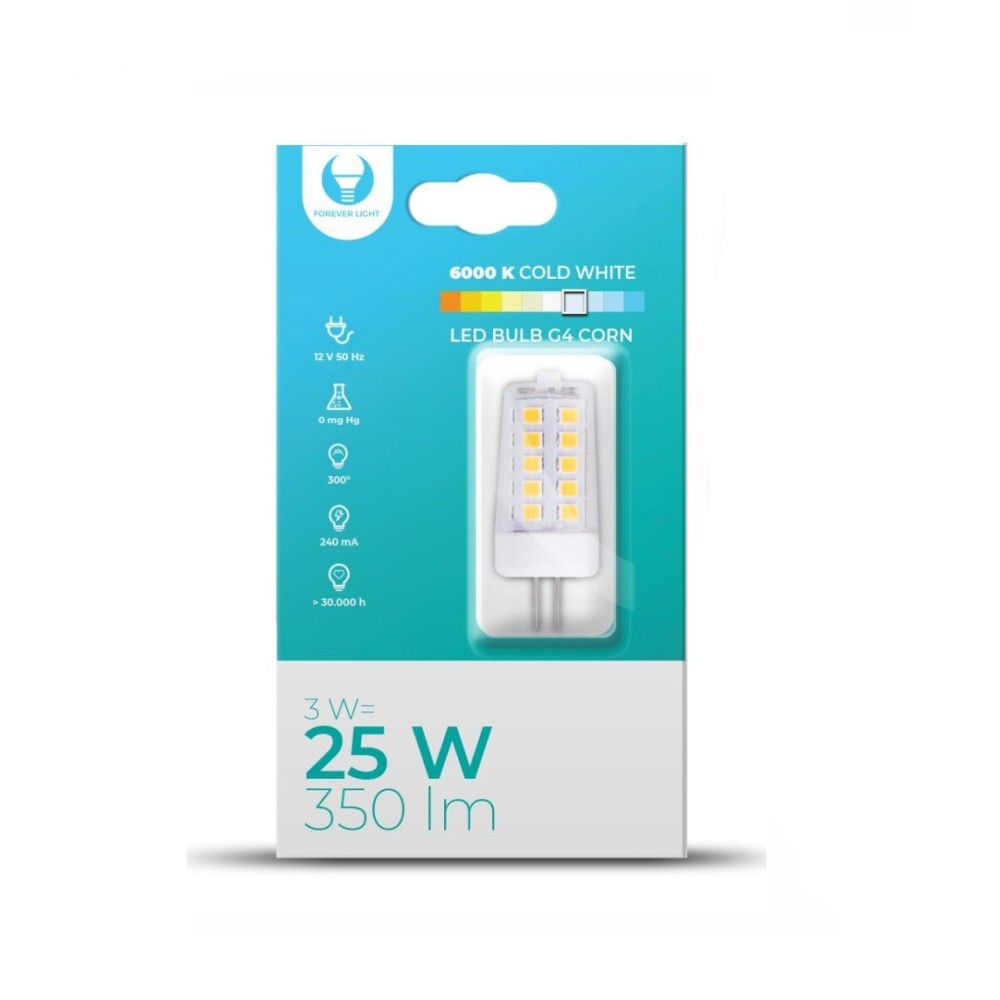 Lâmpada G4, 3W, 12V, LED BULB CORN, 350lm 6000K, branco quente, da marca FOREVER