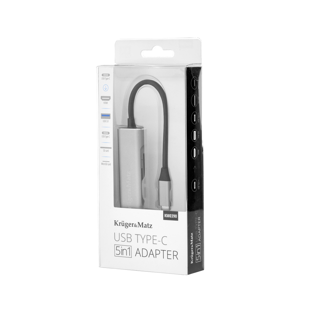 - Quer expandir as capacidades do seu ultrabook ou tablet? Não precisa comprar vários adaptadores diferentes! Agora só precisa de um dispositivo - o adaptador 5 em 1 da Kruger&Matz. Tudo o que precisa é que o seu dispositivo móvel tenha uma porta USB Tipo C e poderá aumentar sua funcionalidade em cinco vezes! O adaptador possui um conector USB 3.0 , ou seja, uma porta USB padrão com maior largura de banda, que permite, entre outros, transferência de dados em velocidades muito mais altas - até 5 Gb/s e conexão de dispositivos como mouse ou teclado. A segunda porta extremamente útil é a saída HDMI que suporta resolução 4K . Conecte seu computador a um monitor ou TV adicional e desfrute de imagens da mais alta qualidade.