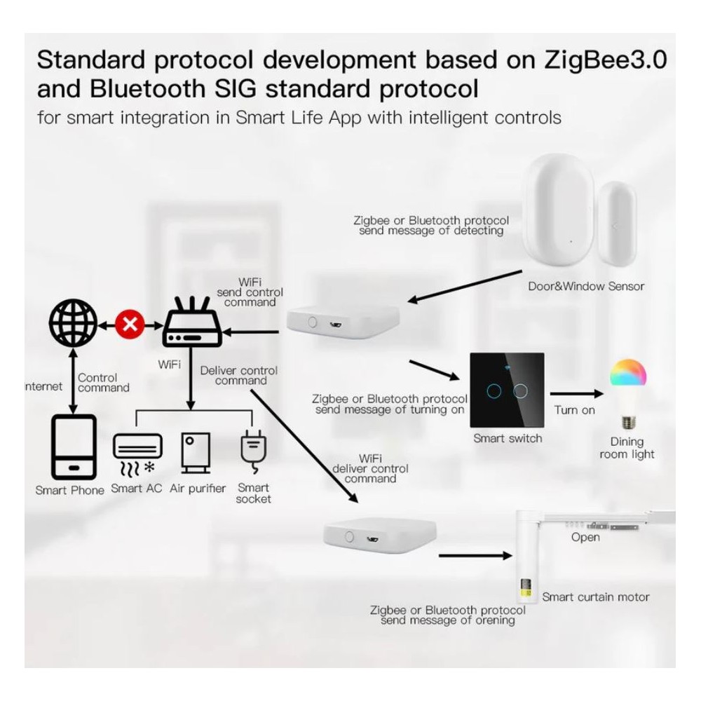 - Suporta controle remoto e controle em grupo de dispositivos inteligentes Bluetooth e ZigBee conectados no aplicativo Smart Life e suporta comunicação multiprotocolo do protocolo padrão ZigBee 3.0 e do padrão Bluetooth SIG. Como um gatilho para a conexão com outros dispositivos inteligentes, ele fornece uma ponte de rede poderosa para todos os dispositivos inteligentes Tuya, que pode realmente conectar toda a casa. Não importa onde você esteja, você pode controlar remotamente os dispositivos conectados ao gateway através do aplicativo Tuya Smart através do seu celular. Em vez de controlar seus dispositivos Bluetooth e ZigBee em duas interfaces diferentes, controle-os todos em um hub de gateway multi-interface. Ele possui um chip Tuya integrado e pode ser controlado por voz através da Alexa e do Google Home, liberando suas mãos em outro sentido.