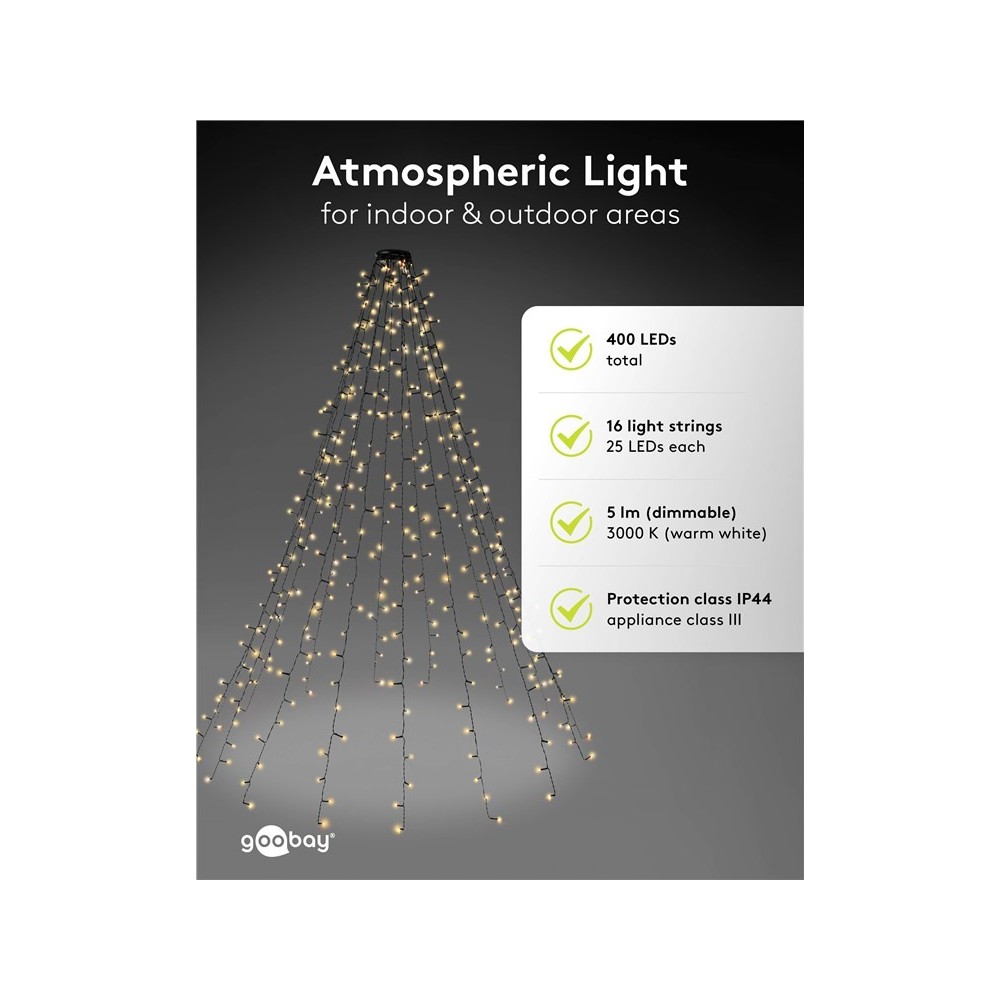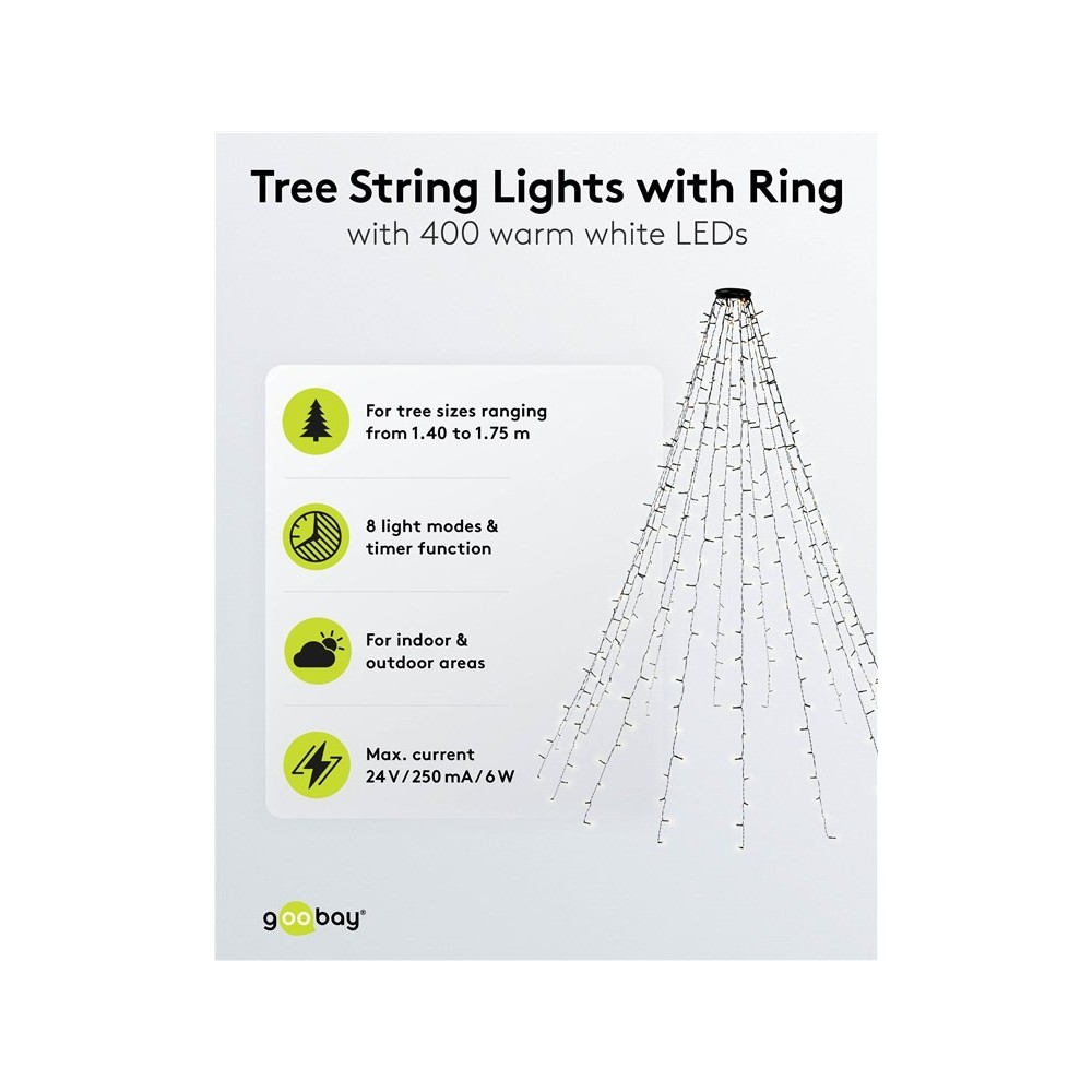 Cordão de luzes LED para árvore com 400 LEDs e anel, 16 x 1,5m