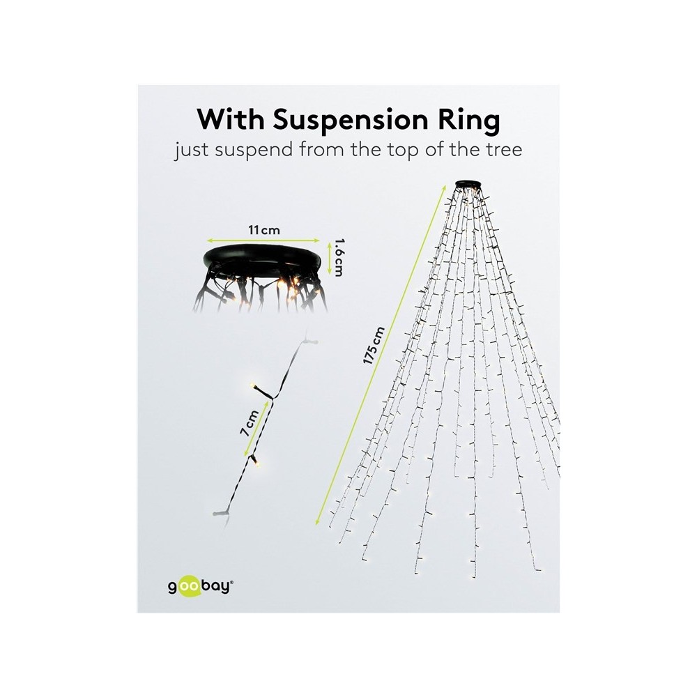 - As luzes de Natal suspensas por um anel são adequadas para árvores de Natal com altura entre 1,40 e 1,75 m.