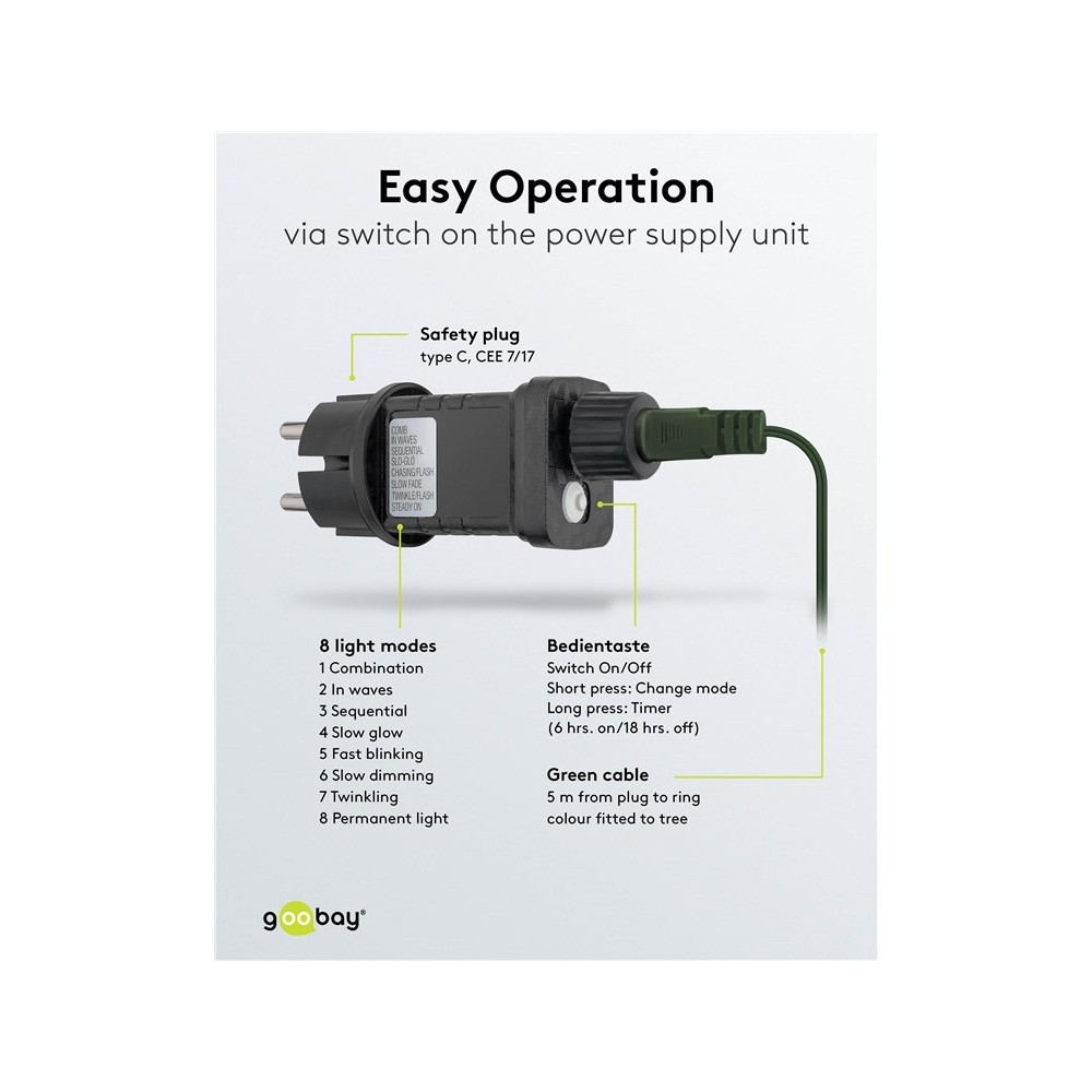 - Adaptador de tomada com 8 modos (combinação, ondas, sequencial, brilho lento, mudança rápida, diminuição lenta, cintilação, luz contínua), temporizador de 6 horas ligado/18 horas desligado, função de memória.