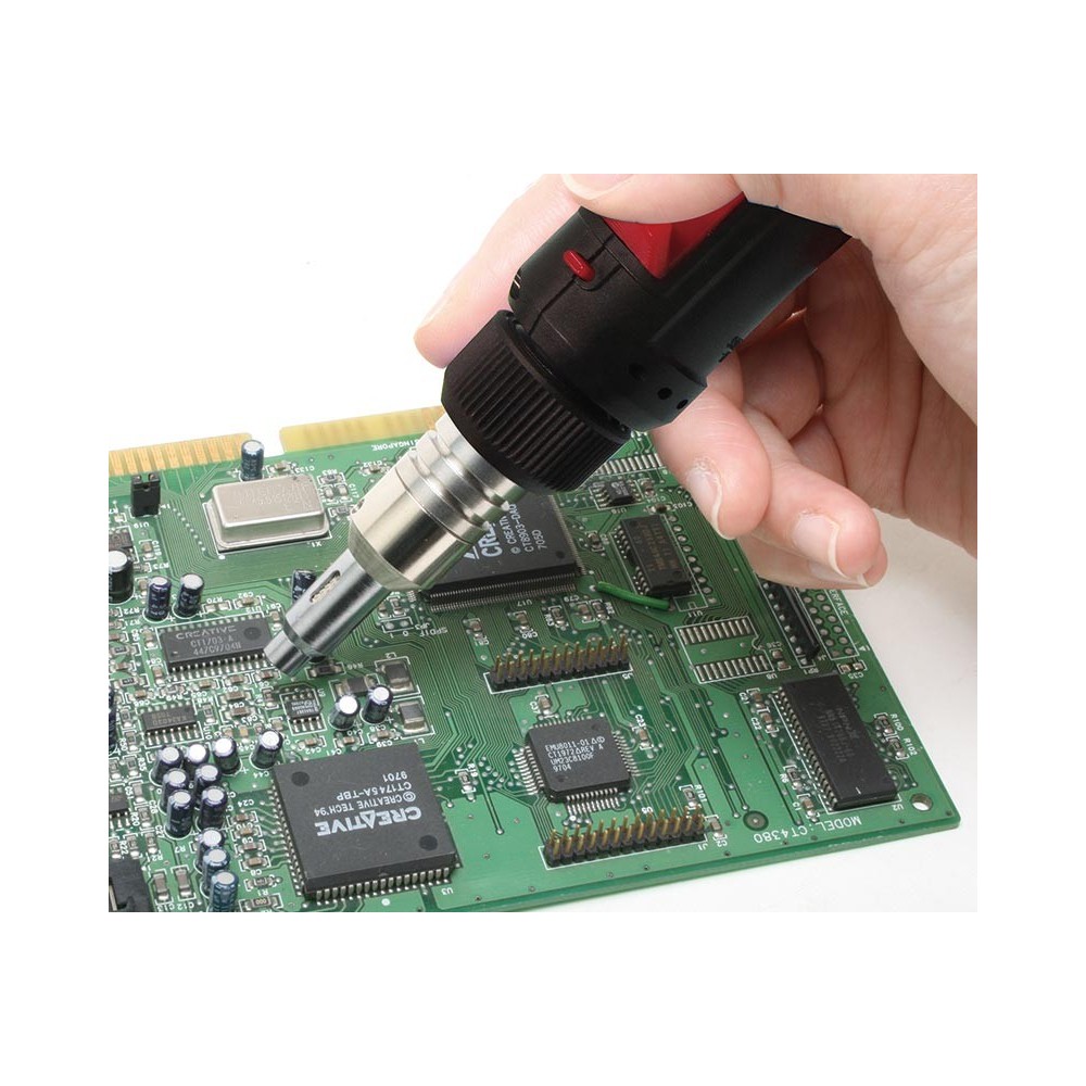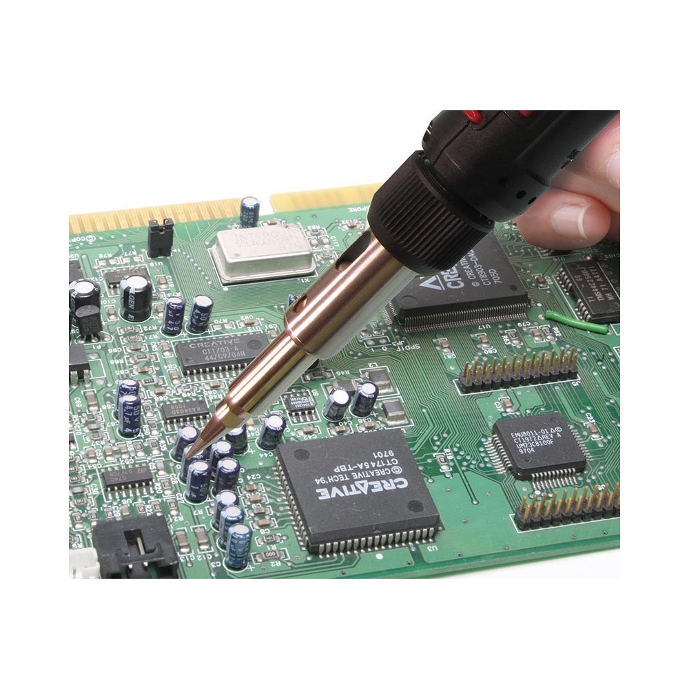 - Contém ponta de solda de 2,4 mm, ponta de dois gumes, bico de ar quente, ponta defletora de ar quente para termorretrátil, rolo de estanho sem chumbo e esponja de limpeza de ponta.