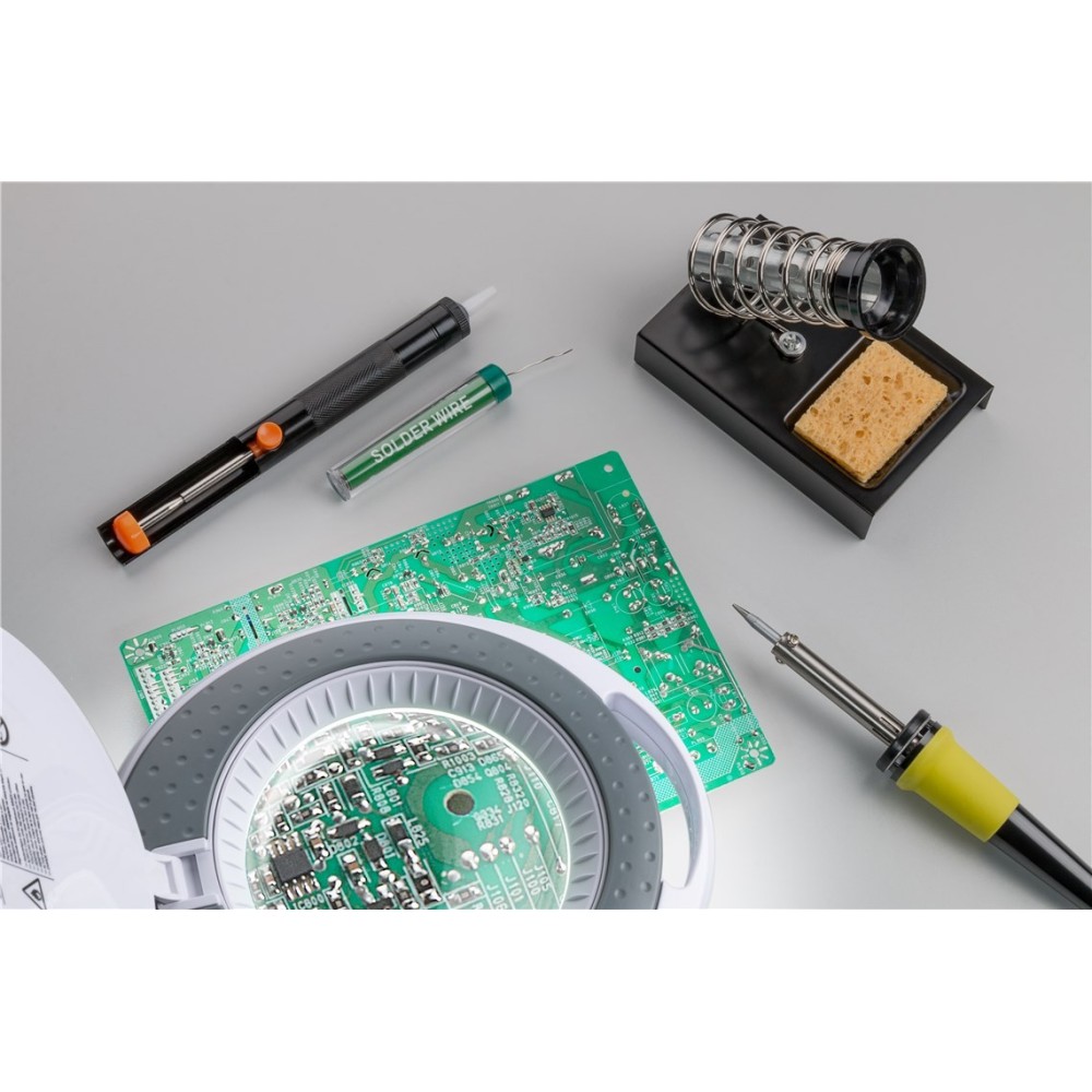 O conjunto de ferro de soldar para amadores fornece o equipamento básico para todos os tipos de trabalhos de soldagem, por exemplo, em PCBs, SMDs, DIP e aparelhos elétricos. A solução compacta e simples para qualquer faz-tudo.