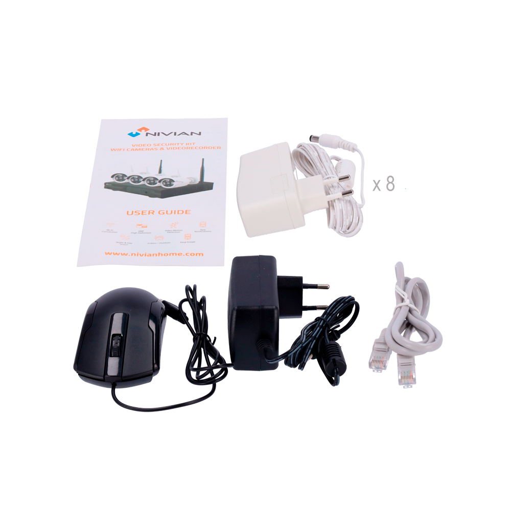 Kit CCTV WiFi Nivian, gravador IP NVR 10 canais, 8 câmeras WiFi 3 Mpx pré-registadas