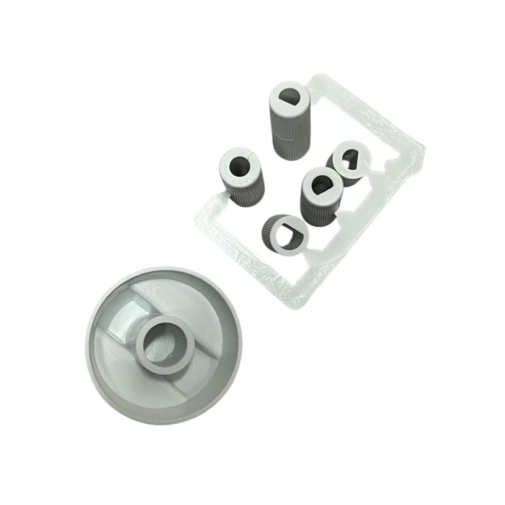 . Inclui um manípulo principal e adaptadores para diferentes tipos de eixos.