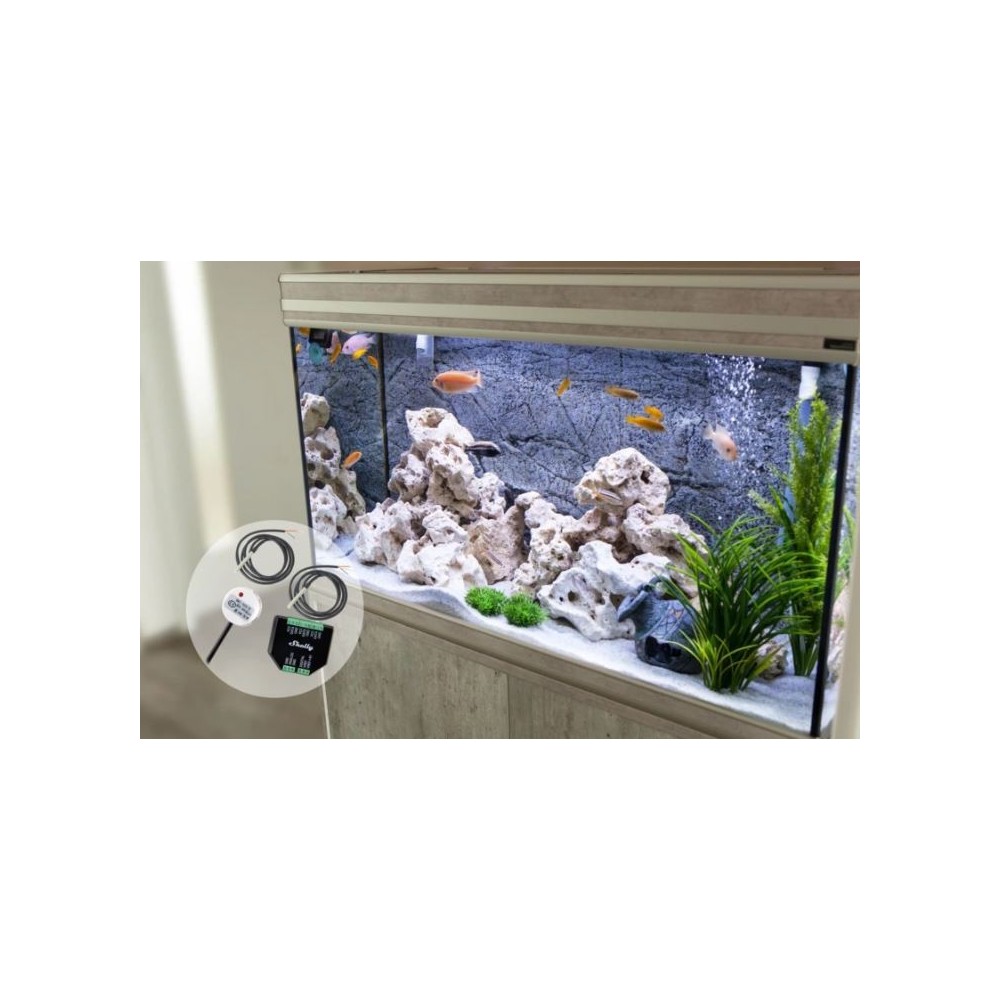 Usando o Shelly Plus Add-On com dois sensores DS18B20, é possível medir facilmente a temperatura dentro do aquário com elevada precisão, bem como a temperatura ambiente. Adicionalmente, podes conectar um sensor de nível de água para ter a certeza de que está sempre no nível ideal.