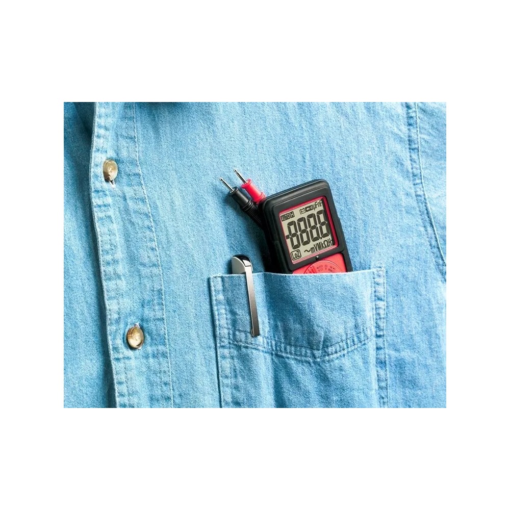 - O display digital é superdimensionado com dígitos grandes e ícones de unidades no display. Apesar de seu tamanho, este multímetro de bolso possui classificação de segurança total para CAT III 300 V, CAT II 600 V e é listado na UL. Nenhum outro medidor tão pequeno oferece tal desempenho e altas classificações de segurança.