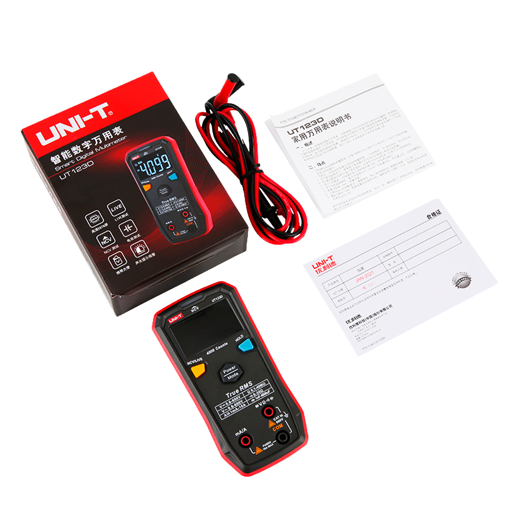 - O multímetro digital inteligente UT123D foi projetado para identificar automaticamente a tensão AC/DC, resistência, díodo e continuidade.