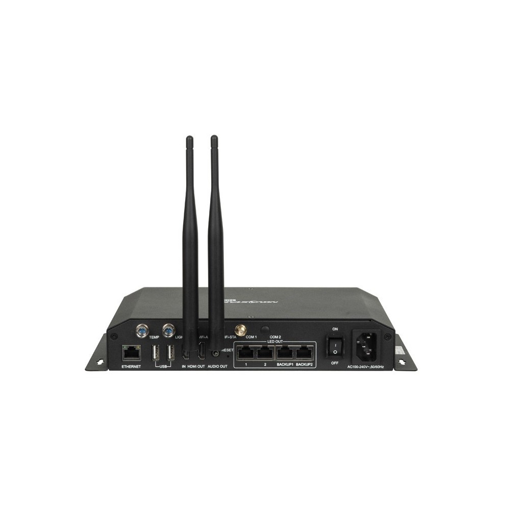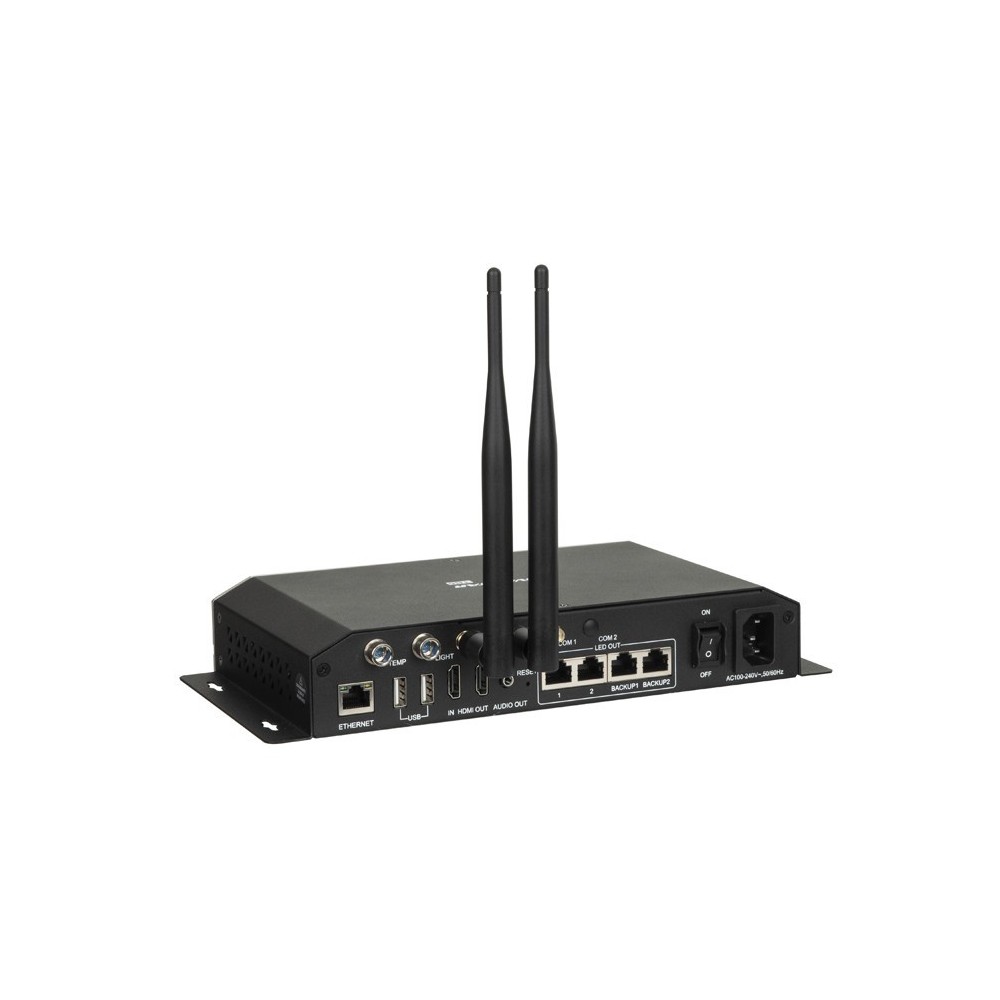 O Novastar Taurus TB6 é um processador LED e reprodutor multimídia em um, adequado para instalações de tela fixa de médio a grande porte. Seu software de configuração inovador e controle de nuvem permitem que você controle um grande display com grande facilidade. Pode ser controlado remotamente por Wi-Fi, rede com fio ou rede 4G. Observe que um módulo 4G opcional é necessário para usar a rede 4G. Uma vez conectado, você pode fazer uma conexão segura e estável através do seu dispositivo Windows, Android ou iOS usando o ViPlex Express, Viplexx Handy App ou VNNOX Cloud. Os aplicativos permitem que você carregue novas mídias e altere as configurações das telas remotamente. Possui quatro portas de saída Ethernet. Dois para conduzir até 1.300.000 pixels e os outros dois podem ser usados para redundância (backup fixo). O conteúdo pode ser carregado para o dispositivo remotamente pela rede ou localmente usando a porta USB do dispositivo e pode ser armazenado na memória interna de 8 GB. A entrada HDMI e o loop podem ser usados para conectar uma fonte de vídeo externa diretamente ao TB6.Equipado com processador de oito núcleos de 1,5 GHz, a reprodução suave de conteúdo de alta definição não é problema algum. Ele também possui duas entradas de sensor integradas, portanto, sensores de luz e temperatura podem ser conectados diretamente ao dispositivo. Isso o torna uma solução ideal para mídia publicitária, sinalização digital e displays comerciais como telas em lojas, shopping centers, hotéis e cinemas.
