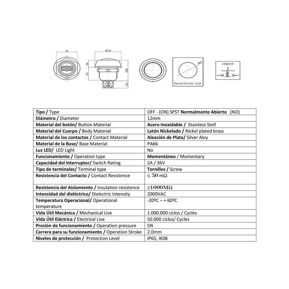 Pulsador Anti-Vandalismo OFF-(ON) SPST Ø12mm