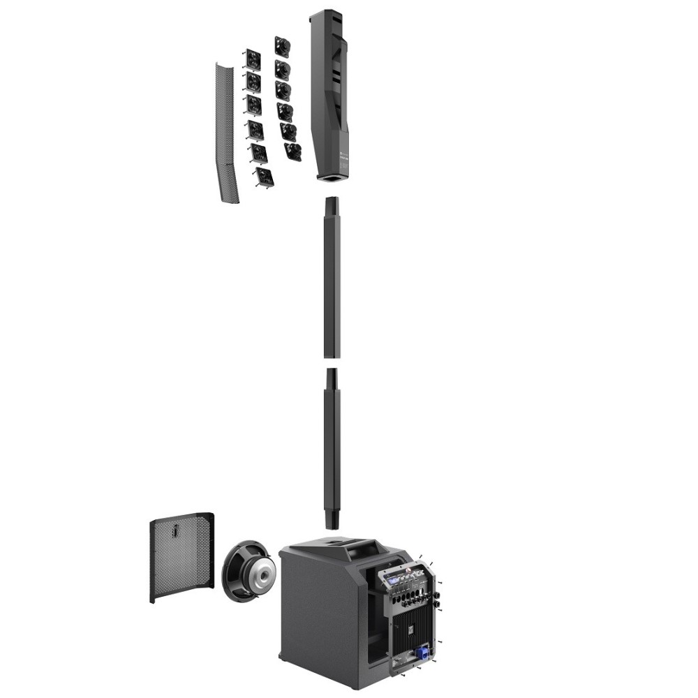 - O sistema inclui um conjunto de altifalantes, um conector de pólo de duas peças, um estojo de transporte de mochila e um subwoofer energizado - todos feitos para embalar e montar rapidamente, ter uma ótima aparência no palco e resistir ao desgaste do mundo real.