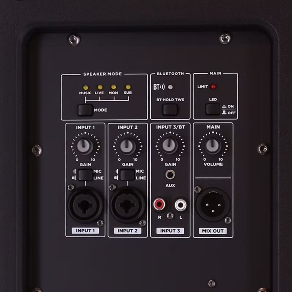 - Entrada 3: RCA e mini jack estéreo de 3,5 mm e BT TWS