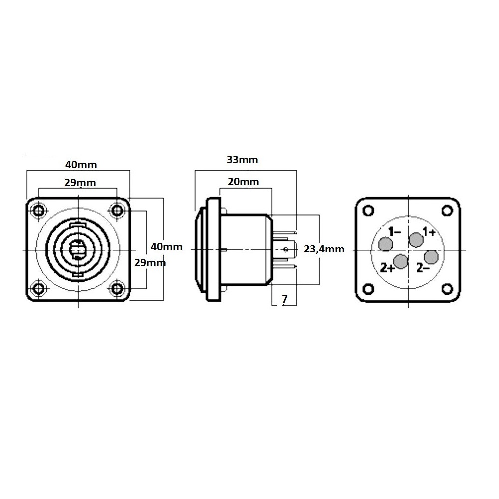 Ficha / Conector de Chassis Profissional, SPEAKON, tipo 'NM', Fêmea, 4 pinos, quadrada