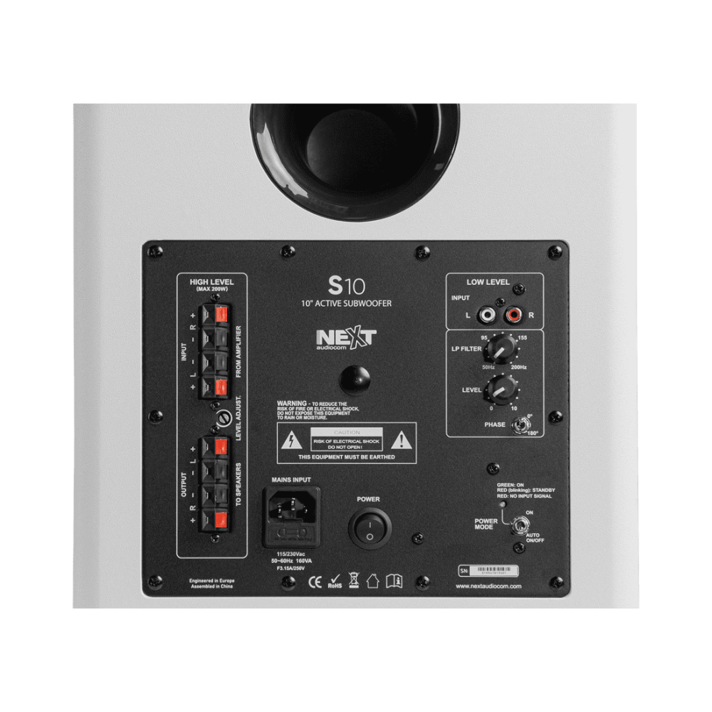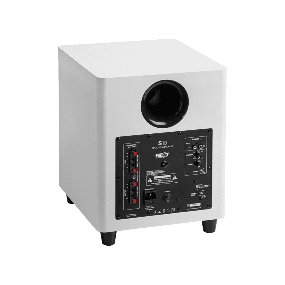 - O S10 é um subwoofer ativo down-firing e bass reflex com graves profundos e definidos, combinando na perfeição com toda a gama da NEXT Audiocom, facilitada pela utilização do crossover ajustável. O design aprimorado, elegante e discreto, associado a uma performance impressionante, faz do S10 uma excelente solução para a sua instalação. O S10 está disponível na cor branca e preta de modo a integrar-se na sua decoração.