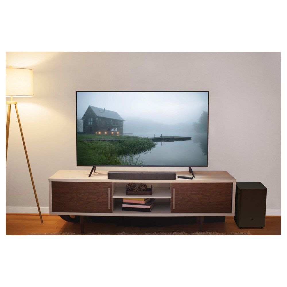 Dê vida aos filmes com o som surround JBL, sem o incômodo de fios ou alto-falantes adicionais.
