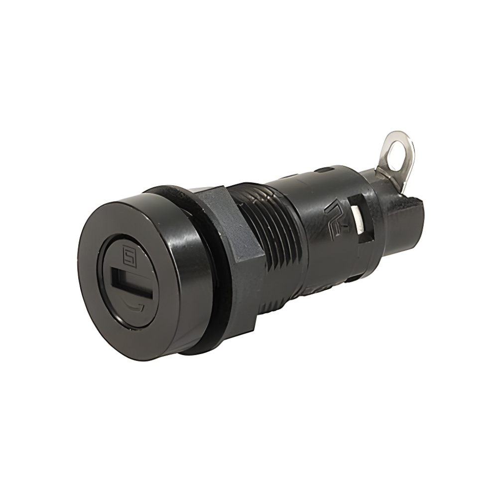 Suporte de fusíveis 5x20mm para painel até 10A em cor preto.