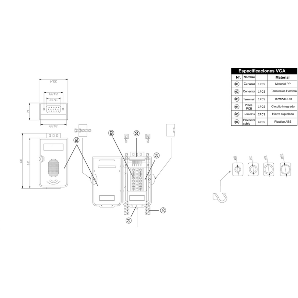Conector VGA com terminais, permite conexão manual de cabo e conector.
