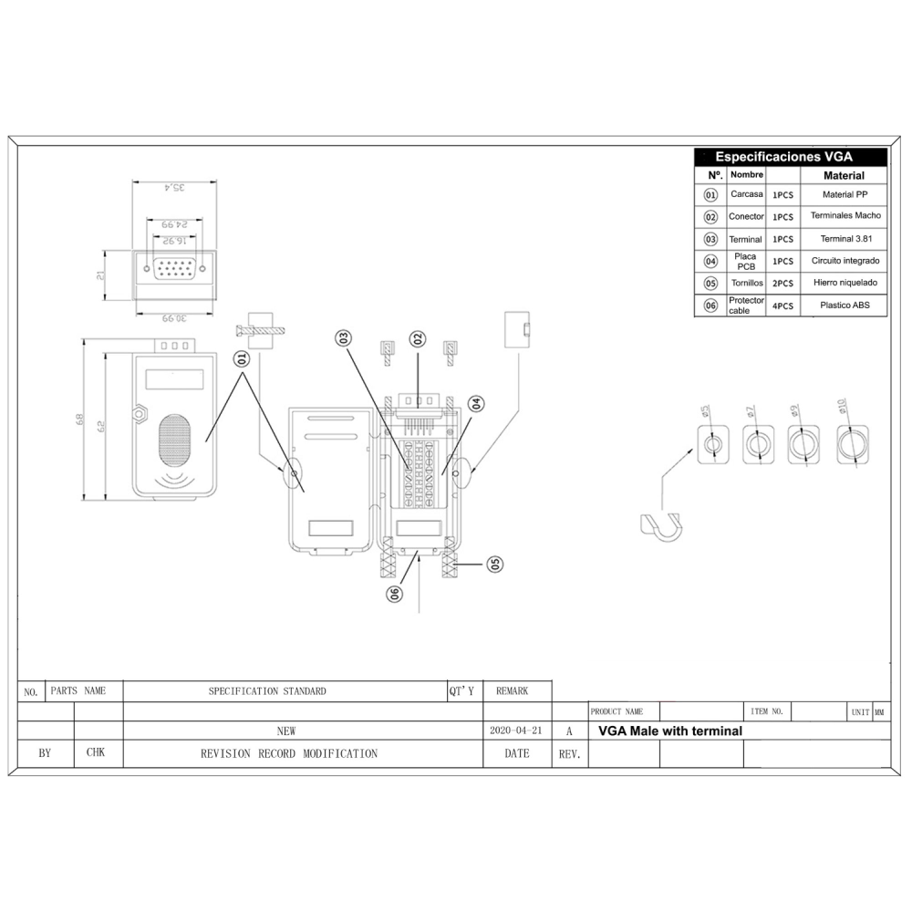 Conector VGA macho para cabo com ligação por terminais de parafuso. Inclui capa de ficha.